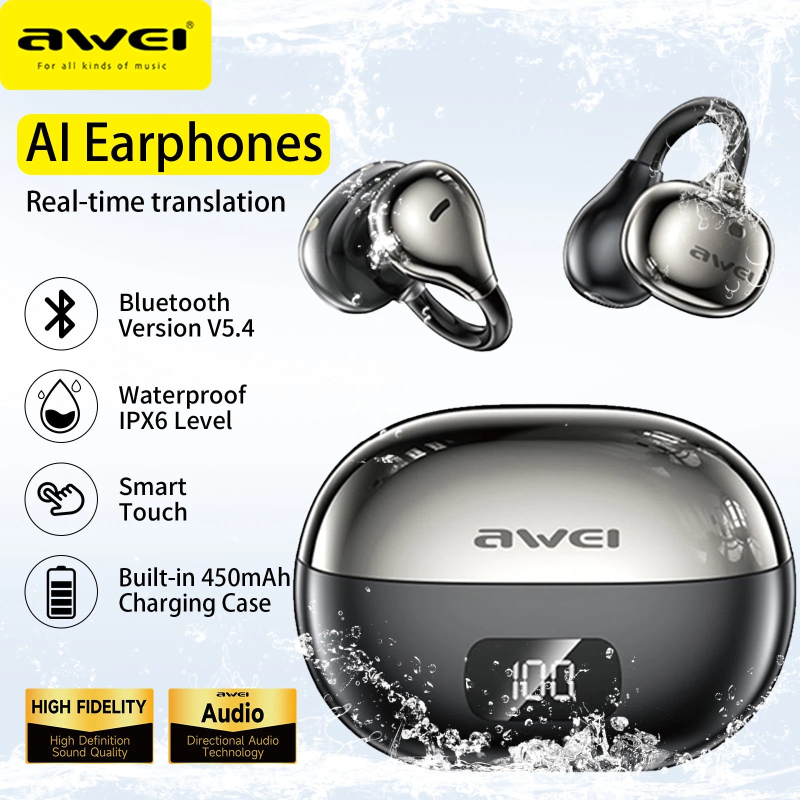 Audífonos inalámbricos con diseño open clip 👂 que brindan comodidad y ajuste seguro. Cuentan con carcasa electroplating elegante ✨, sonido de alta definición 🎶 y resistencia al agua IPX6 💦. Incluyen pantalla digital de batería 🔋, control táctil inteligente 👆 y Bluetooth 5.4 para conexión estable 📶. Ofrecen hasta 5 h en llamadas, 7 h de música y carga rápida en 1 hora ⚡.