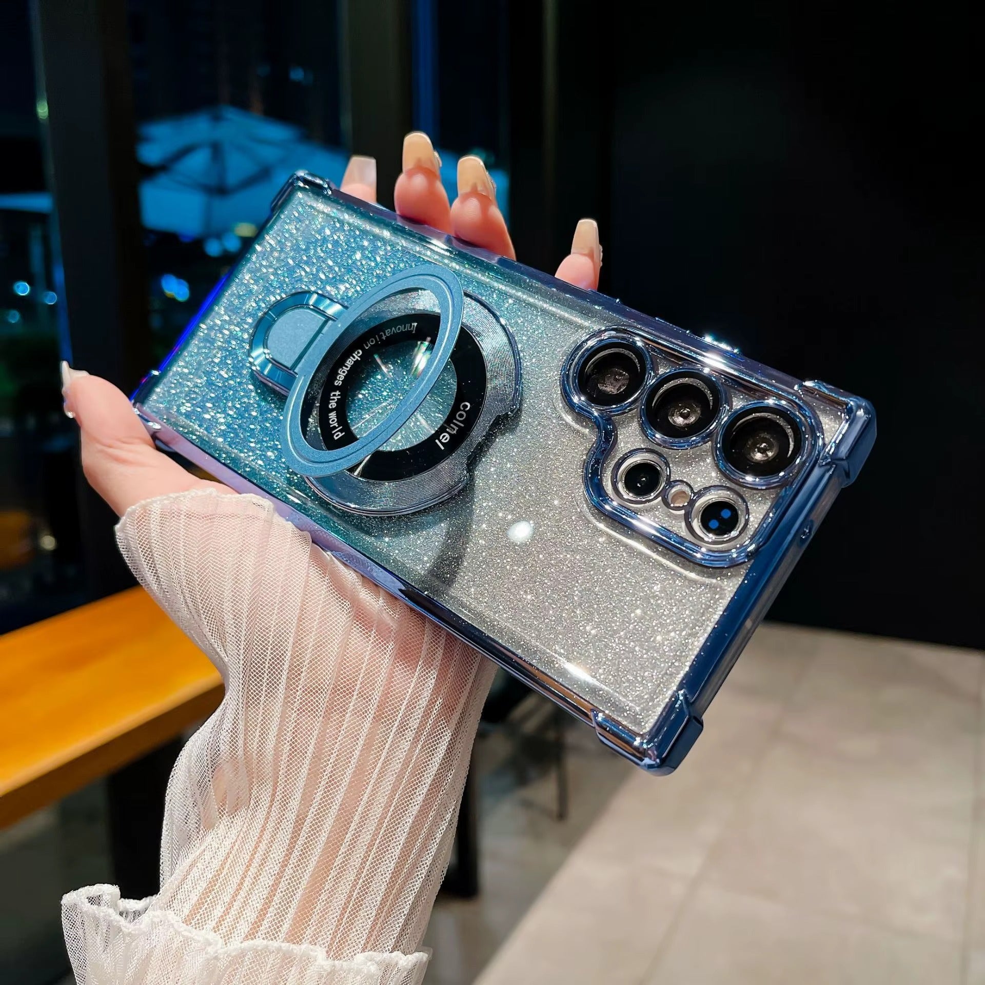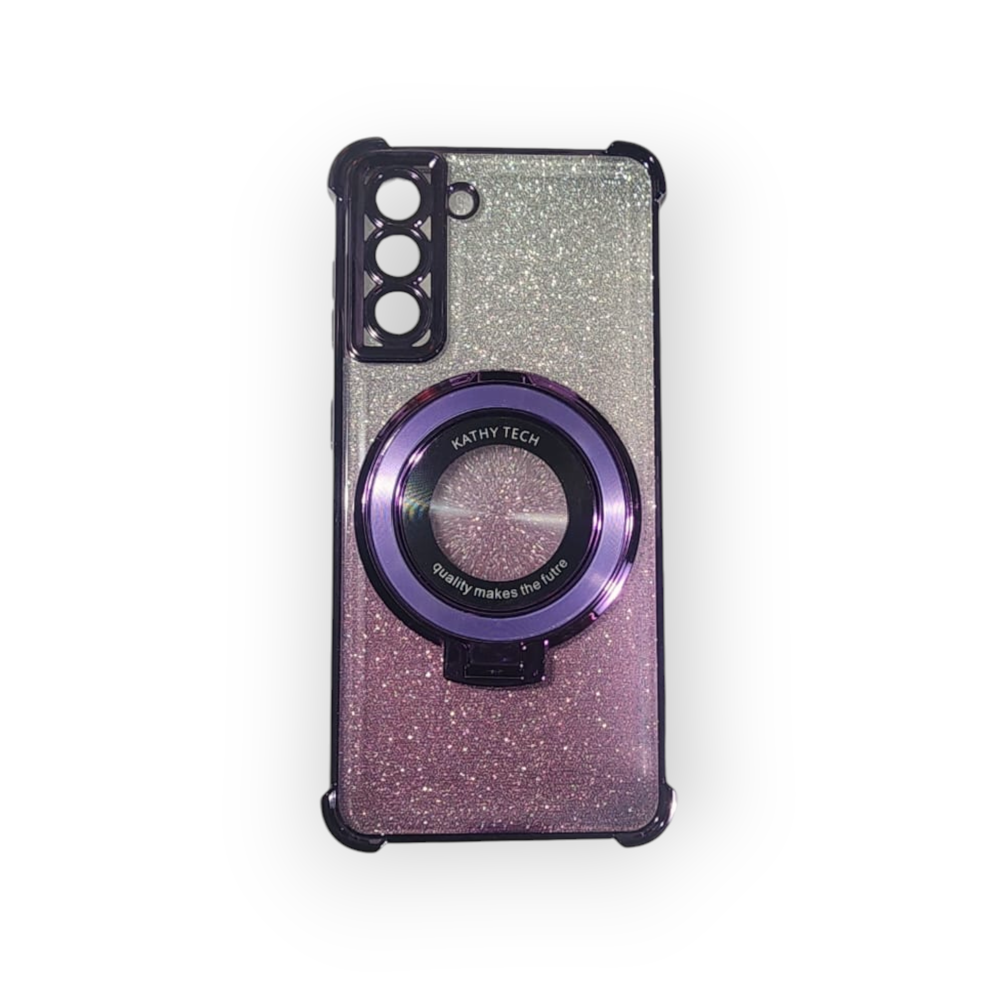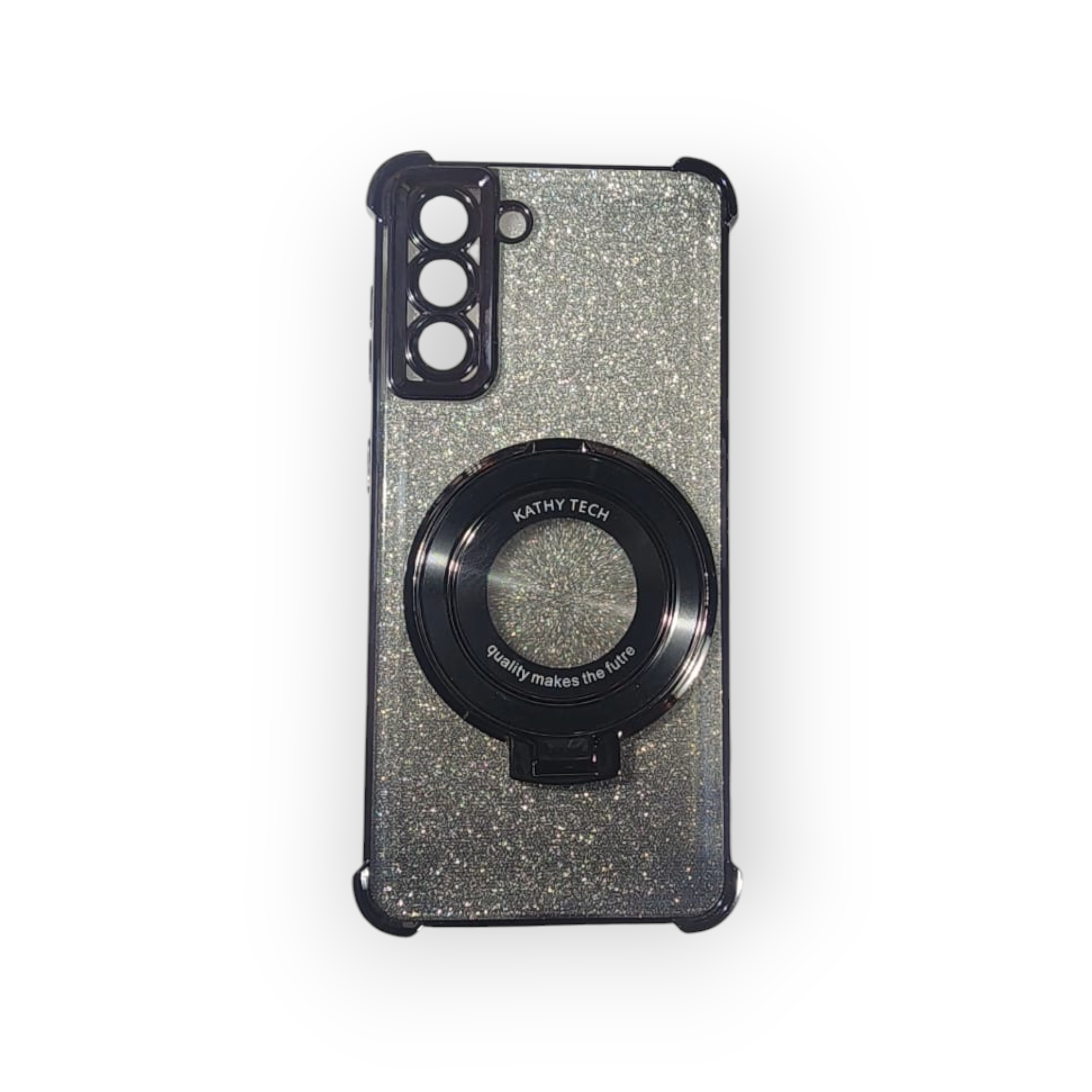 Haz que tu Samsung destaque con este case lleno de personalidad. Su acabado de escarchado le da un toque único y elegante, mientras el holder integrado mejora tu agarre en todo momento. El borde cromado en la cámara no solo aporta estilo, sino también una protección adicional que cuida cada detalle. ¡Funcional, chic y resistente!