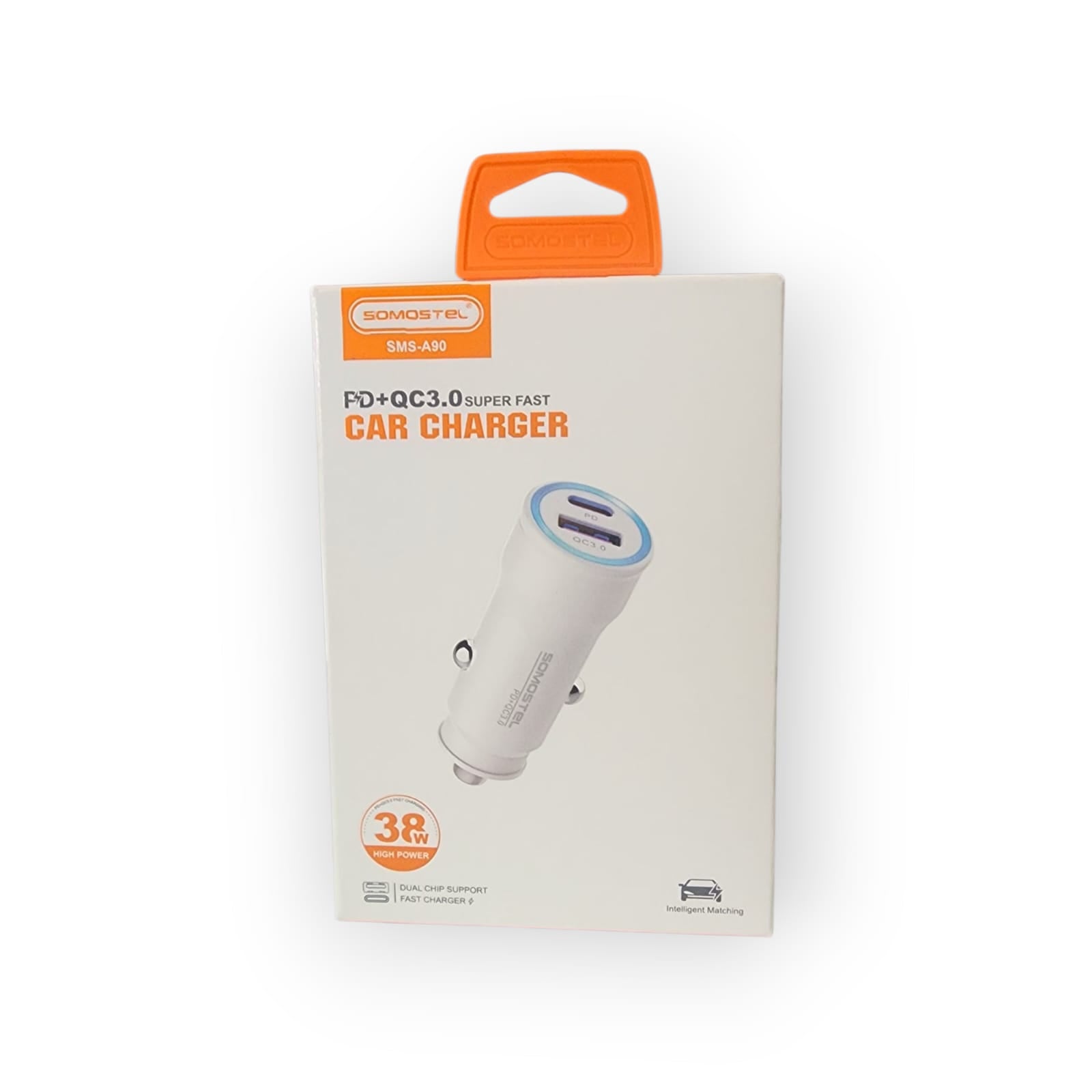 Cargador Vehicular SOMOSTEL SMS-A90 38W con PD y QC 3.0