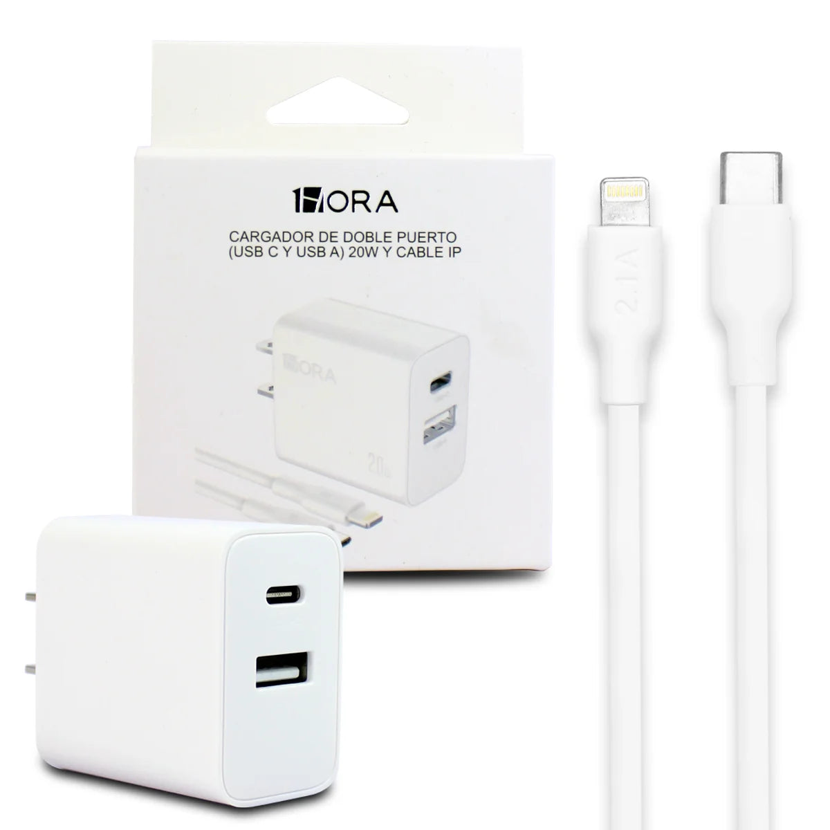 Cargador de pared 1Hora 1 puertos tipo C, 1 puerto USB + cable C a Lightning 3A/20w GAR163